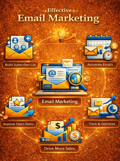 Email marketing is a powerful way to connect directly with your audience through personalized messages, offers, and updates. It helps build trust, nurture relationships, increase repeat purchases, and drive consistent conversions by delivering the right content to the right people at the right time.